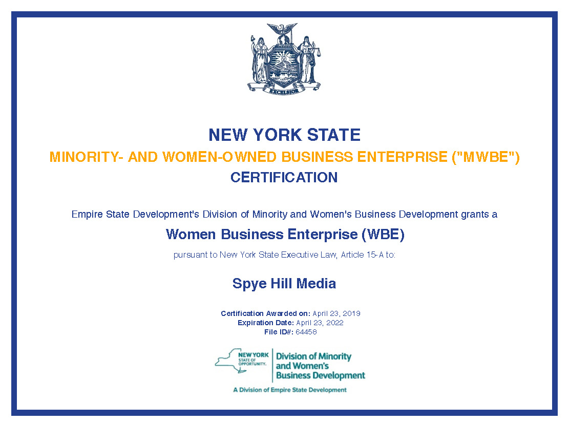 Spye Hill Media, NYS WBE-certified business (2019-2024).